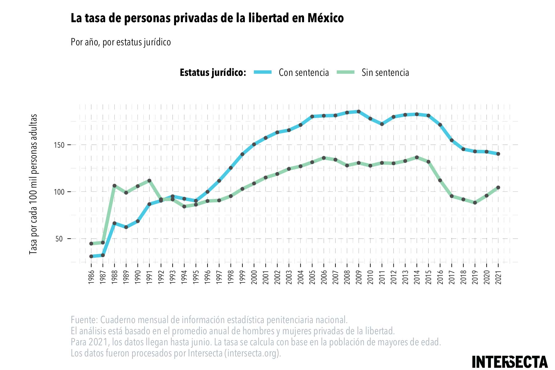 Todo lo que hemos visto hasta ahora cobra sentido si también analizamos los números. En Intersecta, a través de una solicitud de acceso a la información pública,1 obtuvimos los cuadernos mensuales de información estadística penitenciaria nacional que hoy publica el Órgano Administrativo Desconcentrado de Prevención y Readaptación Social desde 1986. Desde entonces se puede ver cómo la proporción de personas en prisión preventiva ha sido alta. Como se muestra en la gráfica, en ese año, el porcentaje de personas privadas de la libertad ascendía al 58.9%. Estamos hablando de prácticamente 6 de cada 10 personas en prisión preventiva en la década de los ochenta.