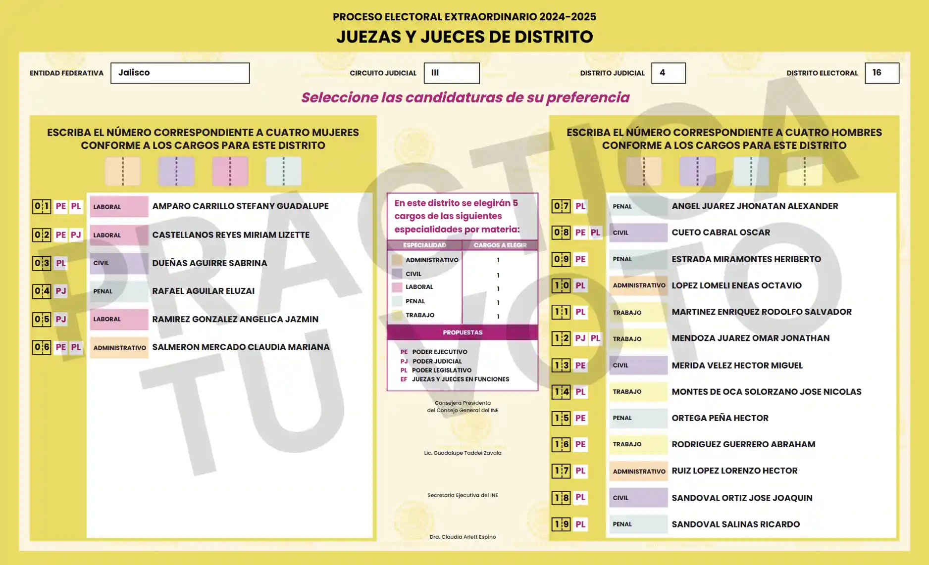 Éste es uno de los casos más ilustrativos para explicar la votación doble por el mismo cargo y de cómo las probabilidades de quién podría ganar y perder ya están distribuidas casi en su totalidad. En esta boleta para juezas y jueces federales del distrito judicial 4, del circuito III, en Jalisco, la instrucción en ambas columnas de candidatas y candidatos es llenar todos los recuadros.