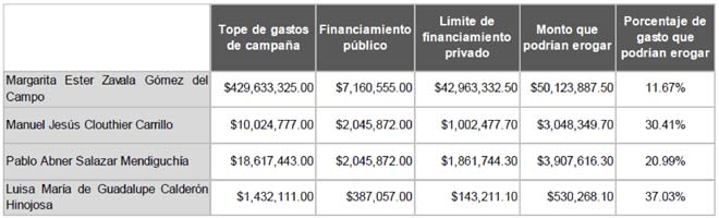 El problema de las reglas establecidas para el financiamiento privado es que son traducidas en topes de campaña que atendían a la naturaleza del candidato. Los candidatos postulados por los partidos contaban con el tope de gastos de campaña establecidos por la fórmula de la ley y, en el caso de los independientes, el tope de campaña está constituido como una restricción legal, al tener un límite de 10% por financiamiento privado. Los montos son los siguientes:4