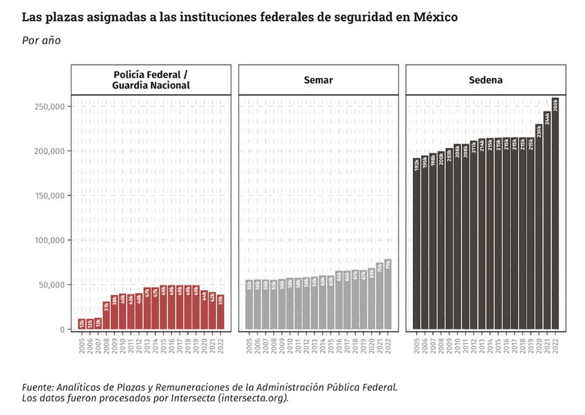 Respecto al número de plazas asignadas a cada una de estas instituciones, las cifras de la SHCP muestran el crecimiento continuo de poder humano que han tenido las fuerzas armadas, contrario a lo observado para la Guardia Nacional. Mientras que desde 2019 las plazas asignadas a la Guardia Nacional han ido en constante baja —pasando de ser 49,486 a 38,734, una reducción de casi el 12% en 3 años—, las plazas asignadas a la Semar y a Sedena han aumentado año con año. En específico, entre 2018 y 2022 las plazas de Sedena aumentaron en 17% y las de Semar en 15% en el mismo periodo. En valores absolutos, en este periodo la Guardia Nacional tuvo 10,752 menos plazas asignadas, mientras que las de Sedena aumentaron 44,453 y las de la Marina aumentaron 11,912. Si se hubieran tomado en serio el mandato constitucional de 2019, los números estarían invertidos.