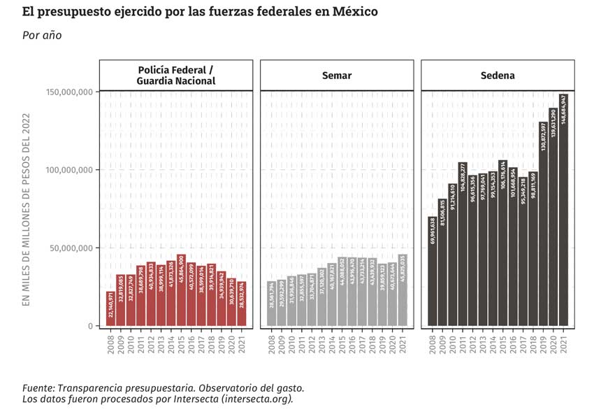 10 Si se compara desde 2008 —año en que se echaron a andar estrategias de militarización de la seguridad pública tales como el Operativo Conjunto Chihuahua—, el presupuesto ejercido por la Sedena se ha duplicado en comparación con 2021; es un aumento de $78,723,309. En el informe Dinero para la violencia hay, pero ¿en qué lo invierte el Estado?, de Intersecta, se analiza el crecimiento del poder presupuestario y humano de las fuerzas armadas en los últimos años con más detalle.