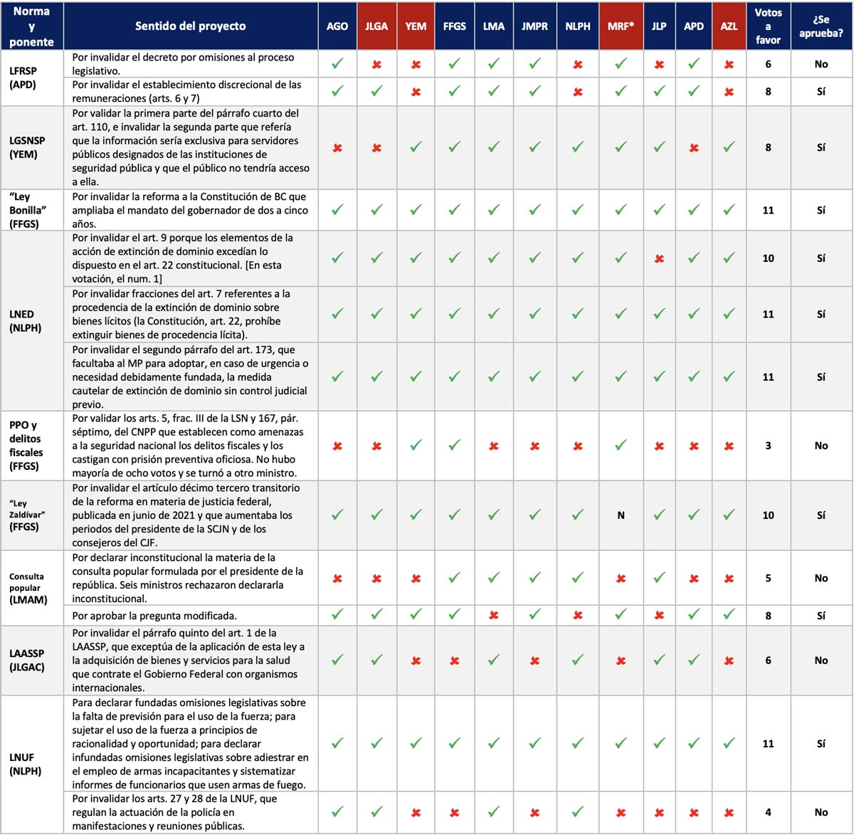 • Ley Nacional sobre Uso de la Fuerza (octubre de 2021). No se alcanzó la mayoría de ocho votos requerida para invalidar los artículos 27 y 28 de esta ley. Por esta razón, se declaró constitucional su contenido, referente a la actuación policial en manifestaciones públicas y se instruyó al Congreso a legislar sobre la finalidad del uso de la fuerza y su sujeción a los principios de racionalidad y proporcionalidad. Cuatro ministros apoyaron sin éxito la invalidación: Alfredo Gutiérrez Ortiz Mena, Juan Luis González, Luis María Aguilar y Norma Lucía Piña Hernández.