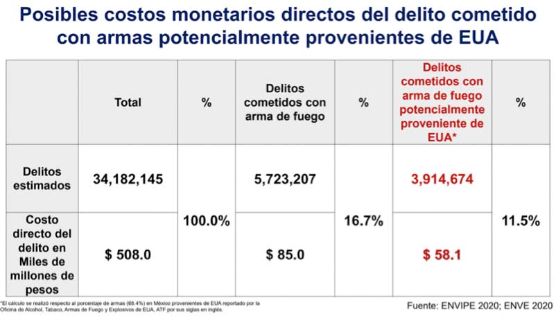 Por conducto de la Secretaría de Relaciones Exteriores, nuestro gobierno presentó una demanda civil ante una corte federal en Boston, Massachusetts, en contra de 11 compañías productoras y distribuidoras de armas de fuego en Estados Unidos, cuyas pistolas, rifles de asalto y anti-materia frecuentemente ingresan de forma ilícita al país y son decomisados por autoridades. México alega precisamente que, como resultado de conductas intencionales y negligentes en sus prácticas comerciales, las demandadas facilitan enormemente el tráfico ilegal de estas armas, las cuales son utilizadas en delitos que resultan en homicidios, lesiones, familias y comunidades truncadas, gastos en atención médica, afectación a infraestructura y equipo de seguridad gubernamental e incluso en pérdida de ingresos por comercio y turismo. En otras palabras, son tales armas –calculadas en alrededor de 500 000 al año– las que alimentan la violencia armada, perpetúan la situación de inseguridad y merman la tranquilidad, bienestar y desarrollo de la población mexicana y del país.
