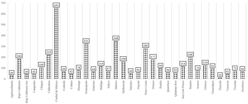 Figura 1. Número de defensores públicos por entidad federativa. INEGI, Gobs. Locs., 2021