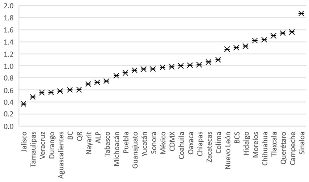 En términos generales, se observan tres grupos de entidades. Por un lado, destacan las defensorías públicas de los estados de Jalisco, Tamaulipas, Veracruz, Durango y Aguascalientes, por tratarse de instituciones que, en promedio, emplean a una defensora pública por cada dos defensores públicos. Por otro lado, aparecen las defensorías públicas de los estados de Guanajuato, Yucatán, Sonora, Edo. Mex., CDMX, Coahuila, Oaxaca, Chiapas, Zacatecas y Colima, pues emplean una mujer defensora por cada hombre defensor empleado. Finalmente, sobresalen los estados de Nuevo León, Baja California, Hidalgo, Morelos, Chihuahua, Tlaxcala, Querétaro, Campeche y Sinaloa, pues se trata de entidades en donde las defensorías públicas contratan a tres defensoras por cada dos defensores públicos.