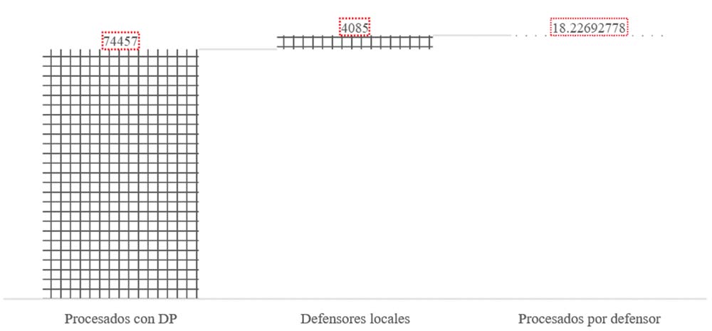 Así, dentro de este universo de sujetos procesados, los registros administrativos indican que 37.2 % procesados contaron con los servicios de un defensor público, 25.5 % con un defensor privado, mientras que en el 35.7 % de los casos no es posible identificar el tipo de defensor.5 A partir de esta información es posible calcular que, en promedio, cada defensor público local representa a 18 nuevos procesados por el sistema de justicia penal, cada año a nivel nacional. En otras palabras, según esta información, cada defensor público local debe representar a tres nuevos procesados por el sistema penal cada dos meses.