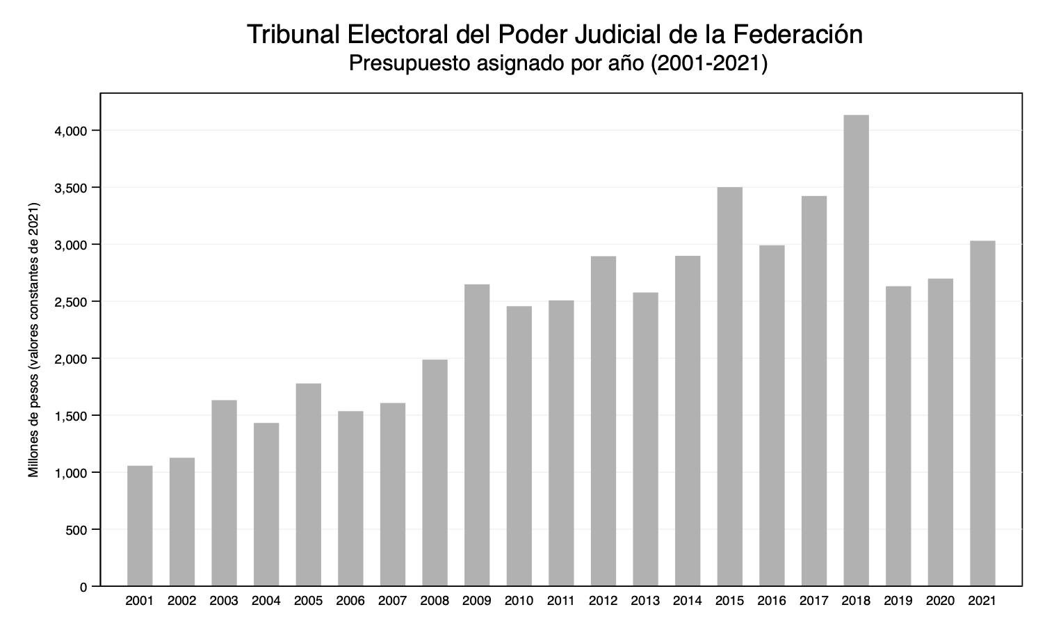 Una de las consecuencias de estas trasformaciones fue la conformación de un Tribunal Electoral acaudalado. Esto es especialmente visible en el incremento del presupuesto que año con año se asigna a la institución, el cual en términos reales pasó de poco más de mil millones de pesos en el año posterior a la elección presidencial de 2000 a alrededor de 2600 millones al año siguiente de la elección de 2018 (ver gráfica 1). Vale la pena reiterarlo: el incremento no sucedió en el vacío, estuvo condicionado por innovaciones jurídicas que ampliaron las facultades del TEPJF. Ejemplo de ello es la configuración de las salas regionales en órganos permanentes a partir de la entrada en vigor de la reforma de 2007-2008 o la creación de la Sala Especializada que desde 2014 está a cargo de resolver los procedimientos especiales sancionadores.
