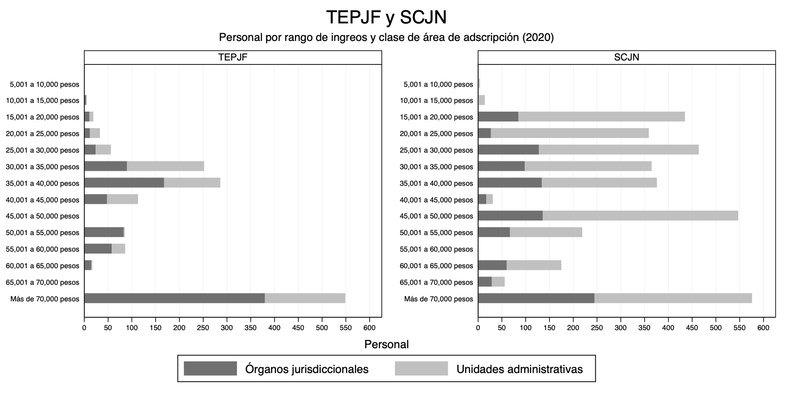 Conviene hacer un alto en el tema de personal para destacar dos cuestiones adicionales. La primera es que la cantidad de posiciones que lo integran se ha mantenido relativamente estable pese a la reducción presupuestal que se observa desde 2019. Y la segunda es que no se trata de cualquier estructura de personal, sino de una que, de acuerdo con la edición más reciente del Censo de Impartición de Justicia Federal, se compone mayoritariamente de cargos con ingresos mensuales superiores a 70 000 pesos. De hecho, el 36.6 % de los 1501 cargos que conforman al personal del TEPJF se encuentra en este rango de ingresos, una cifra que contrasta con el 15.9 % que corresponde a la SCJN, cuyo personal asciende a 3621 posiciones. Aunque estas diferencias se explican en parte porque las cifras del TEPJF consideran al personal tanto de Sala Superior como de las seis salas regionales, el contraste entre una y otra institución es revelador para este análisis en la medida en que ofrece evidencia adicional respecto del interés que suscita la presidencia del TEPJF.