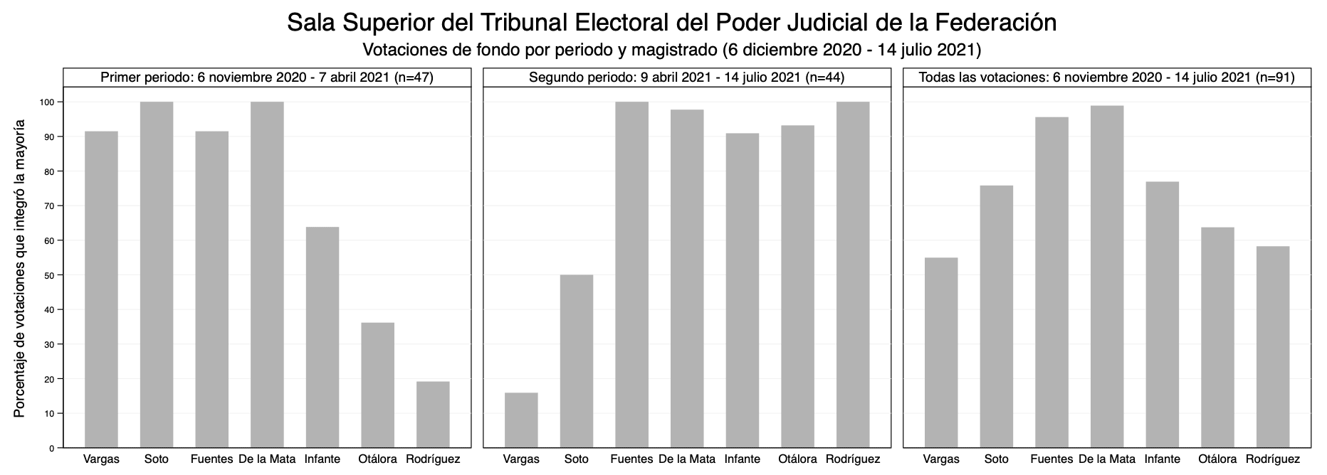 Una forma de comprender este deterioro es observando la forma en que perdió el respaldo de sus colegas en las votaciones de los asuntos de la Sala Superior hasta quedarse constantemente en minoría. De acuerdo con los datos de un documento interno del TEPJF que analiza 91 votaciones de fondo —no improcedencias— no unánimes efectuadas entre el 6 de noviembre de 2020 y el 14 de julio de 2021, el magistrado Vargas formó parte de la mayoría en sólo 55 % de los casos. En contraste, los magistrados Fuentes y De la Mata votaron con la mayoría en prácticamente cada uno de los 91 asuntos (ver tercer cuadrante de la gráfica 4).